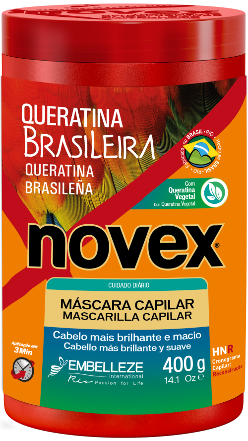 Mask Novex Brazilian Keratin vereint 100 % brasilianisches Keratin mit Vitamin E für eine besonders tiefenwirksame Feuchtigkeitspflege, ideal für extrem geschädigtes und brüchiges Haar.