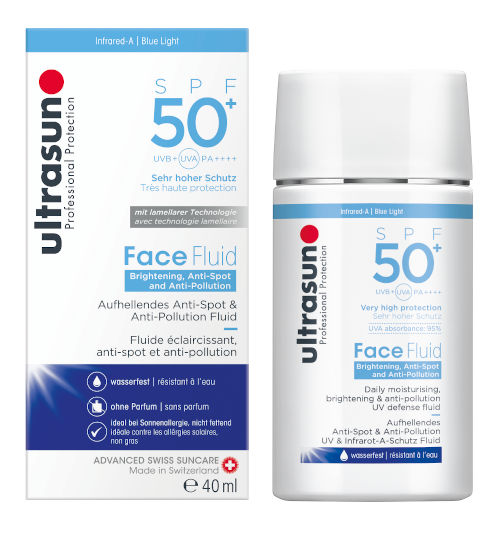 Ultrasun Brightening & Anti-Polution Fluid SPF 50+ sorgt für einen ebenmässigen, strahlenden Teint. Kraftvoller Pflanzenwirkstoff SulforaWhite mit ausgeprägter antioxidantiver Wirkung, gewonnen aus Schweizer Gartenkresse wirkt gezielt auf die wichtigsten Reaktionsschritte in der Melanin-Kaskade.